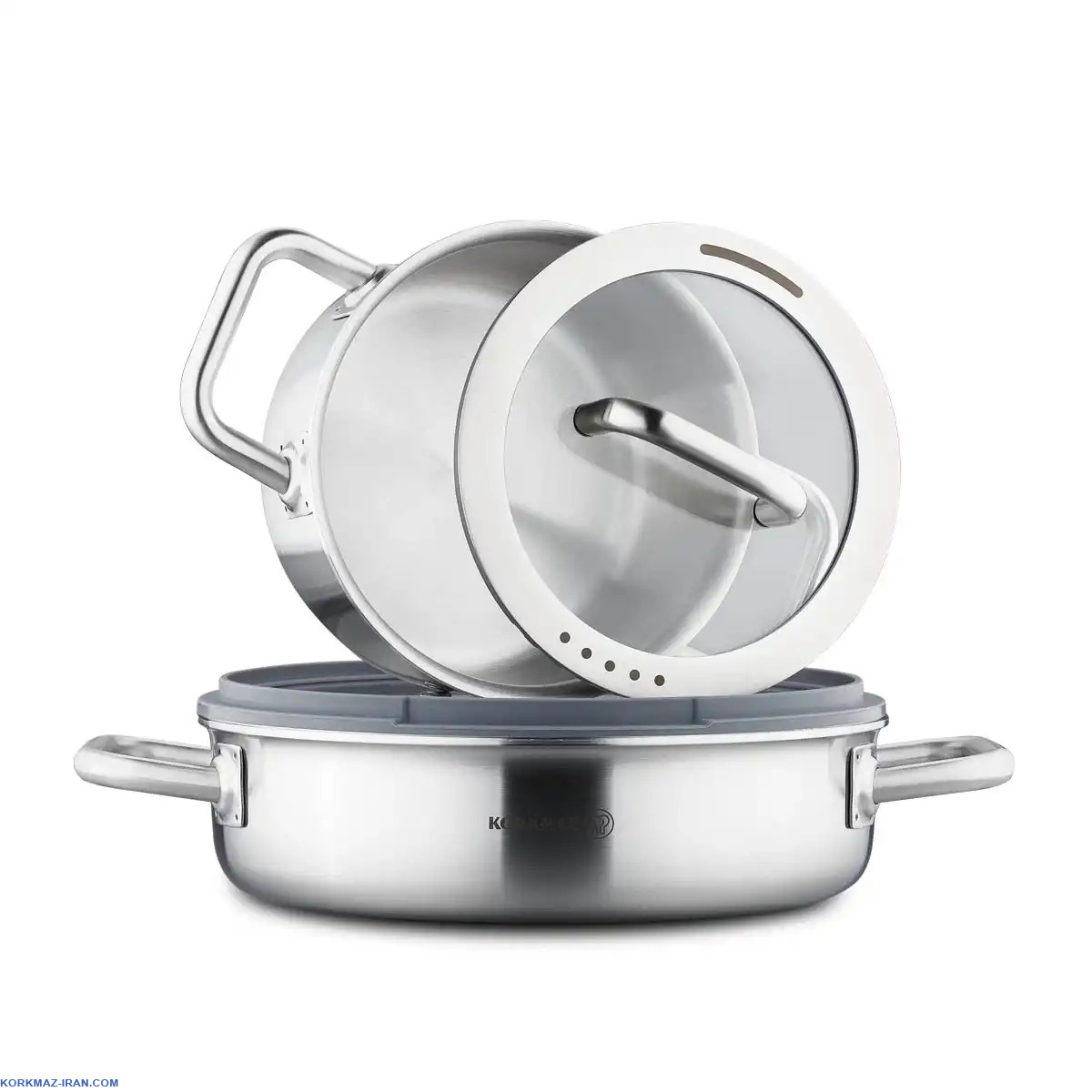سری ظروف پخت و پز Aura، با الهام از طراحی فولاد، سالمترین مادهای که سالهاست در آشپزخانه استفاده میشود، به لطف دستههای مقاوم در برابر حرارت و کف تابشی یکنواخت، عملکرد آشپزی شما را دو برابر میکند. به لطف درب صافی مخصوص قابلمه Alba، میتوانید در همان قابلمه آشپزی کنید و آبکش کنید و بهرهوری را افزایش دهید.